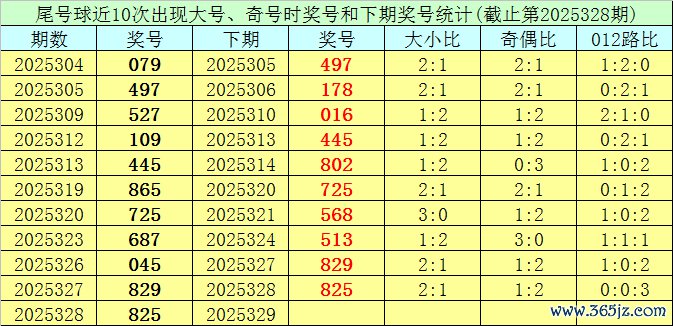 在尾号球前10次开出大号、奇号类型之后,其下期永诀开出奖号:497、178、016、445、802、725、568、513、829、825,其中号码奇偶比为6:4,大小比为8:2,012路比为3:1:6。