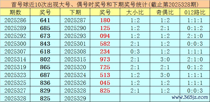 开奖精采:体彩罗列三第2025328期开出奖号825,奖号大小比开出2:1,奇偶比开出1:2,012路比开出0:0:3。